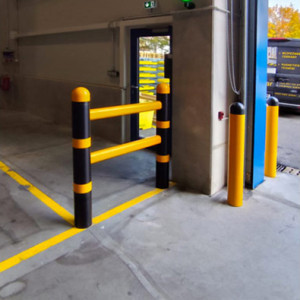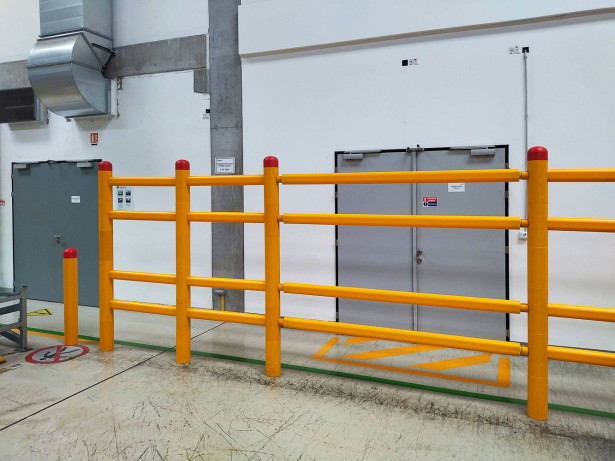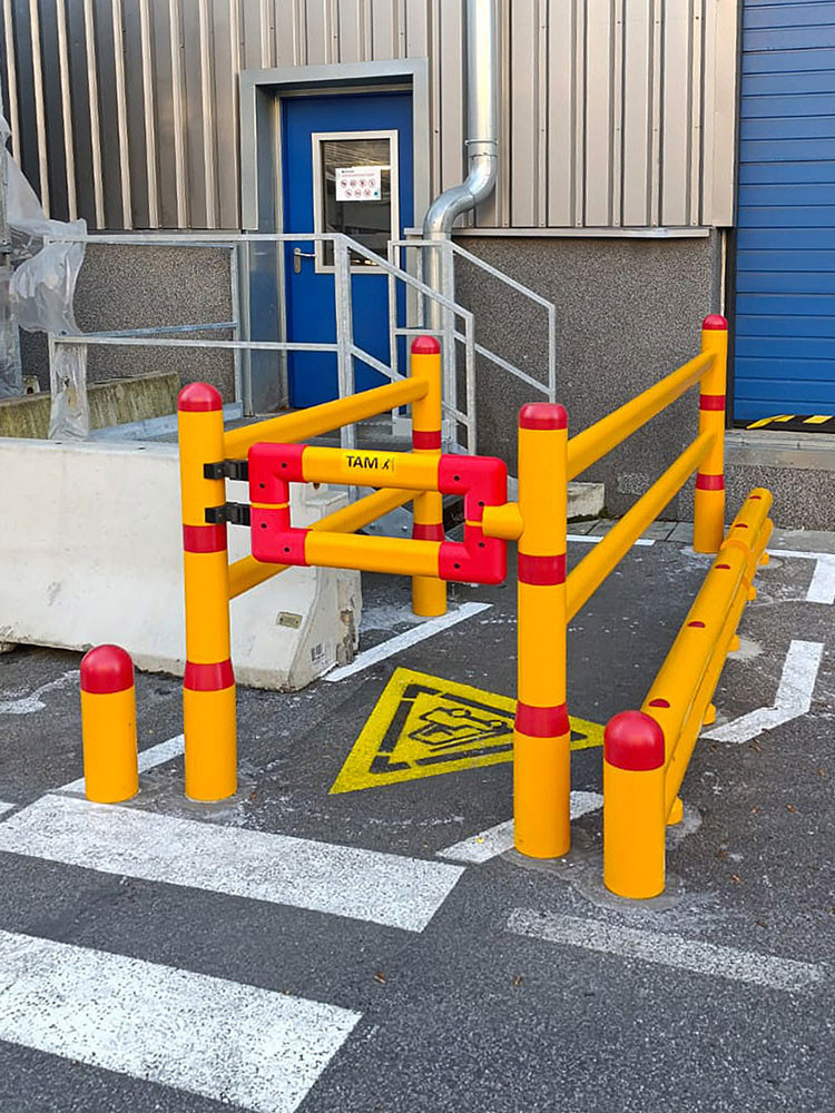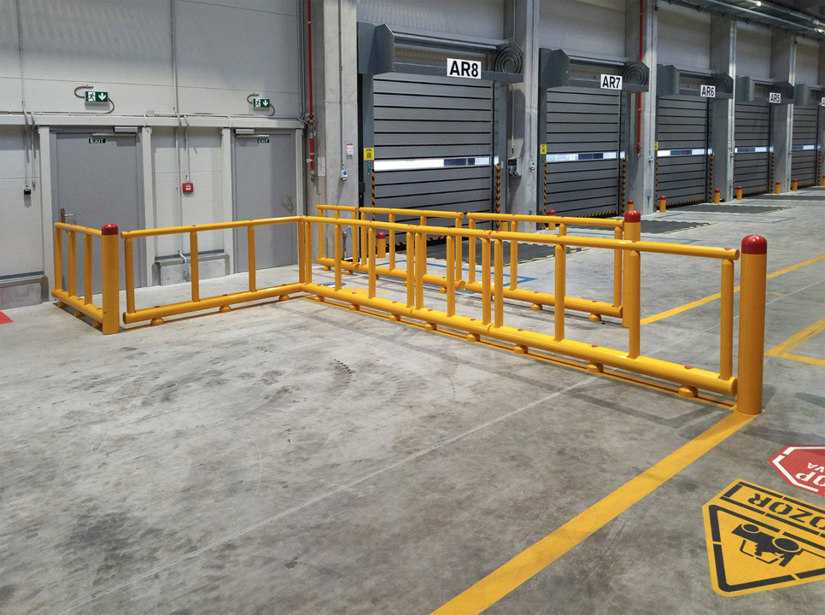 Most often, protection starts with separating pedestrian routes with railings, followed by safety gates at crossing points. Critical points (columns / corners) are addressed with separate protection.